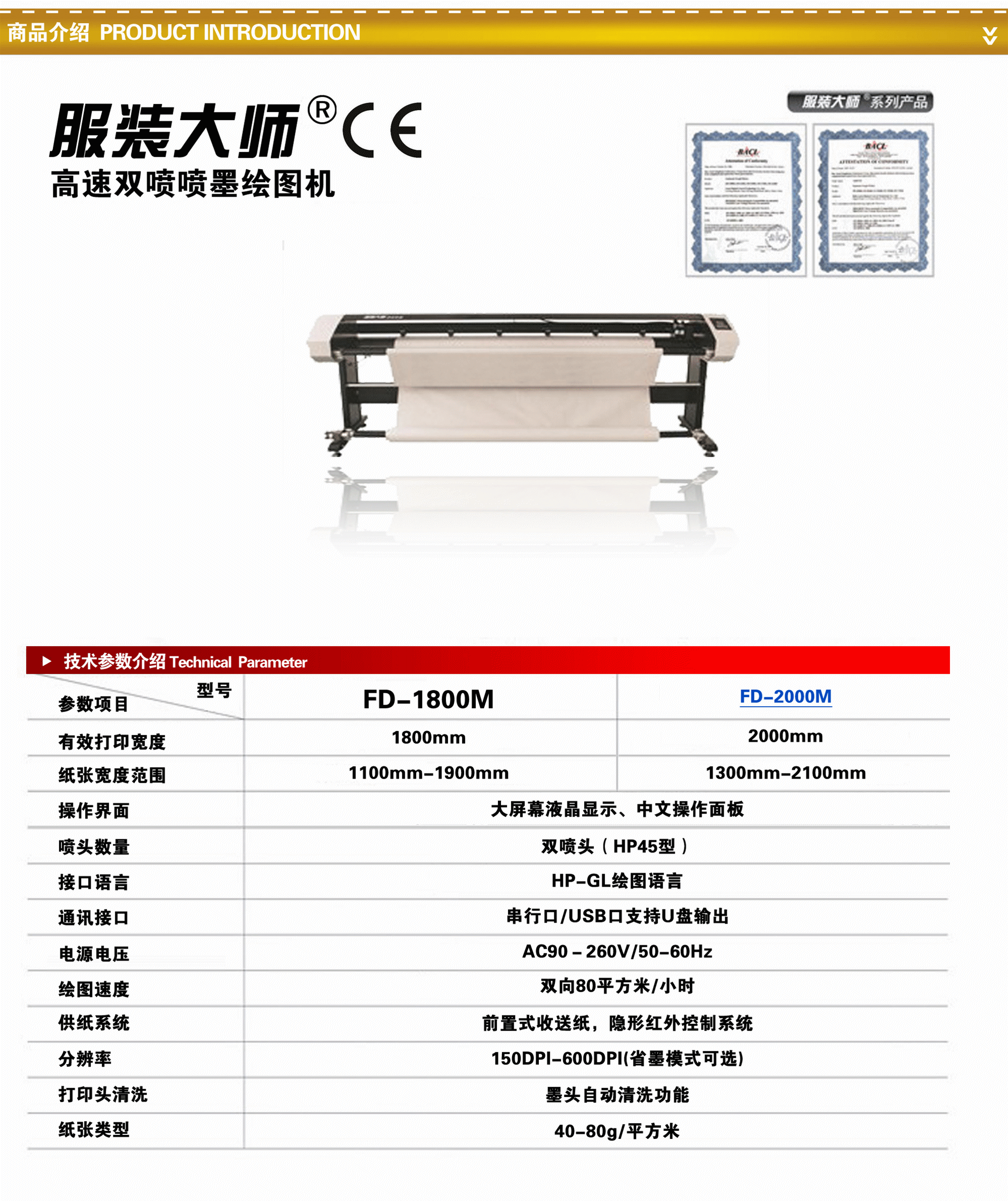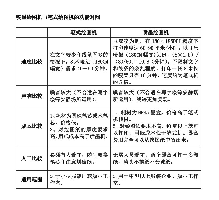 服装大师喷墨绘图机,采用高性能AMD处理器,极速运算,结合专用高速马达驱动控制系统,全程闭环定位,控制精度高,运行速度快,分辨率高,不受图形线条繁简影响,绘图速度均匀。适用于时装、童装、内衣、玩具、箱包等裁片较小、样版量多的企业。相对笔式服装绘图机,其特点是速度快,极静音,磨损少,用纸成本低,无需人看守。